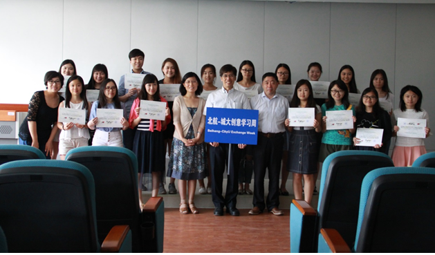 在交流中,两校的师生不时地碰撞出一朵又一朵夺目的思想火花。城大的同学好奇地问到:为什么北京很多地方不开灯呢(白天)?通过共同研讨,两校师生认为北京楼间距较大,香港地狭人稠,高楼簇拥在一起,日光难以满足香港民众的日常活动需要。在饮食文化上,香港的同学酷爱甜食,却对辣味“闻风丧胆”:城大同学说糖浸山楂没味道;我们请城大同学吃麻辣香锅(微辣),他们直摇头后退。城大的同学在乘飞机来首都前,都准备了防雾霾口罩等相关物件,可是北京始终没有给他们机会戴上口罩。这是文化差异之美,需要理解包容,并学会尝试去欣赏。闭幕式最后一项是向明友院长、董敏副院长以及城大的区老师为学生颁发“北航—城大语文创意学习交流周”证书。