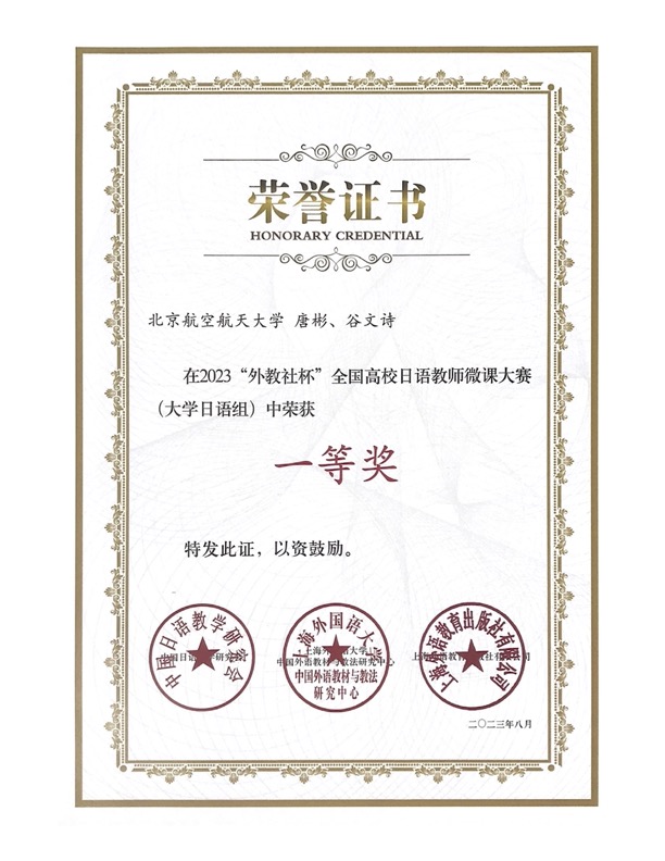 在学院的大力支持下,beat365英国官方网站日语团队的两位青年教师唐彬和谷文诗,充分运用现代化教学手段,生动地呈现了教学内容,同时有机地融入了课程思政元素,展现出北航日语教学的工科特点和“空天报国”的教学理念。在激烈的竞争中,她们的微课作品从180个参赛作品中脱颖而出,荣获全国一等奖,彰显了beat365英国官方网站日语教师扎实的专业功底和出色的信息技术应用能力,为北航日语教育的卓越品质增光添彩。