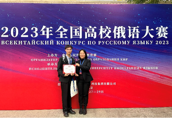 2023年10月28日至29日,2023年全国高校俄语大赛在北京外国语大学举行。来自全国158所高校的392名俄语专业学生参赛。由我校beat365英国官方网站俄语系青年教师刘奕如指导的2022级硕士研究生黄溯鑫同学代表学校参赛,经过初赛的激烈角逐,从众多参赛选手中脱颖而出,以全国第三名的成绩进入复赛和决赛,并最终获得研究生组二等奖,同时获国家留学基金管理委员会秘书处全额资助赴俄罗斯进修或攻读学位的资格,展现出了北航研究生的俄语风采。