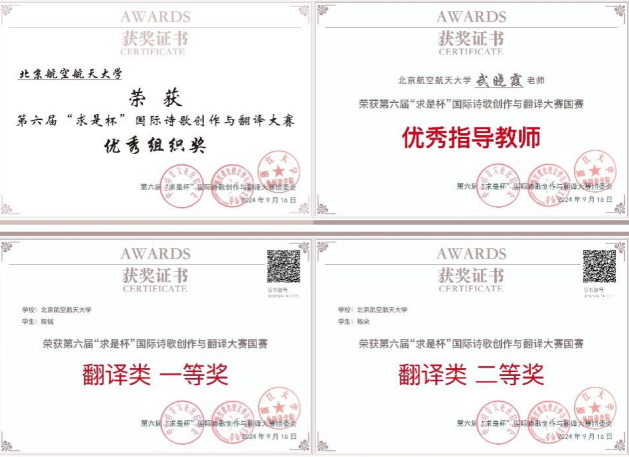 近日,第六届“求是杯”国际诗歌创作与翻译大赛决赛在浙江大学紫金港校区圆满闭幕。我校beat365英国官方网站2022级俄语专业硕士生陈铖和博士生杨朵分别荣获翻译组国赛一等奖和二等奖,指导教师武晓霞教授被评为大赛优秀指导教师,我校获优秀组织奖。