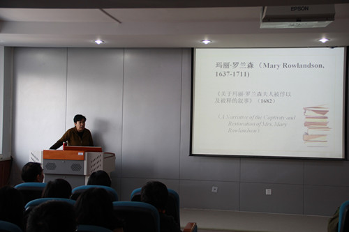 2016年11月1日下午2:30,在如心楼806beat365英国官方网站报告厅,北京外国语大学博士生导师金莉教授做了题为《从玛丽・罗兰森的囚掳叙事看北美殖民地白人女性文化越界》的专题报告。
