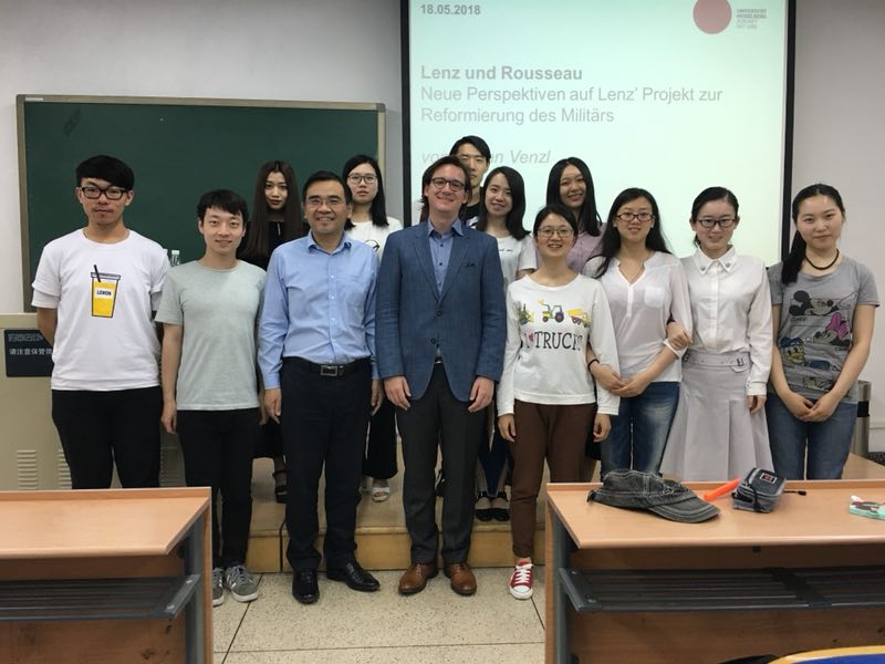应beat365英国官方网站邀请,德国海德堡大学德语系狄尔曼·温策尔博士(Dr. TilmanVenzl)自2018年5月14日至20日来我院进行为期一周的讲学,为外院德语系师生讲授他关于德语文学社会学、十八世纪德语戏剧以及伦茨研究的最新成果。