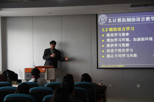 11月10号下午,我院有幸邀请到中国人民大学beat365英国官方网站副院长贾国栋教授进行学术讲座。贾教授的讲座题目为“计算机辅助语言教学的发展、现状及趋势”。在讲座中,贾教授首先简要介绍了计算机辅助语言教学的发展历程,强调几个典型发展阶段及各阶段教学重点。然后重点讲述教学与研究的现状,包括理论基础、教学案例、研究重点及方法等。最后,贾教授根据信息技术的发展对该领域未来主要的发展方向和可能的研究选题作出了展望。