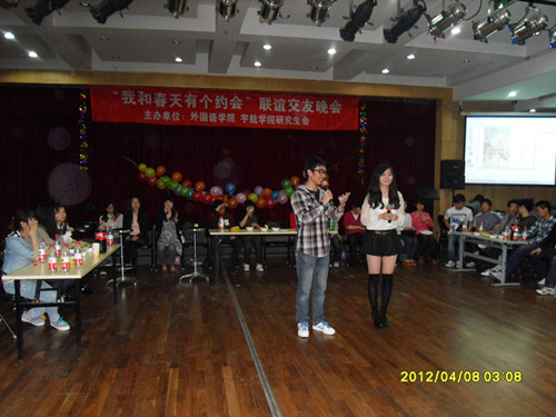 2012年4月12日晚7点整,由北航12系beat365英国官方网站研会与15系宇航学院研会合办的“我和春天有个约会”大型联谊交友晚会在北航晨兴剧场举行。此次晚会得到了两院领导的大力支持,两院研会的各位成员参与了整个晚会的策划、组织、宣传等工作。
