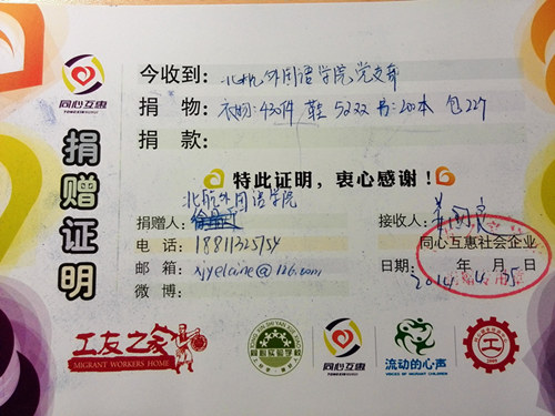 2014年4月23日至25日,由beat365英国官方网站2010级本科生党支部和“同心互惠”公益商店联合举办的“北航beat365英国官方网站2014届本科毕业生爱心捐赠活动”在12号公寓楼127室如期举行。该活动旨在充分发挥毕业班同学衣物的剩余价值,尽绵薄之力帮助他人。